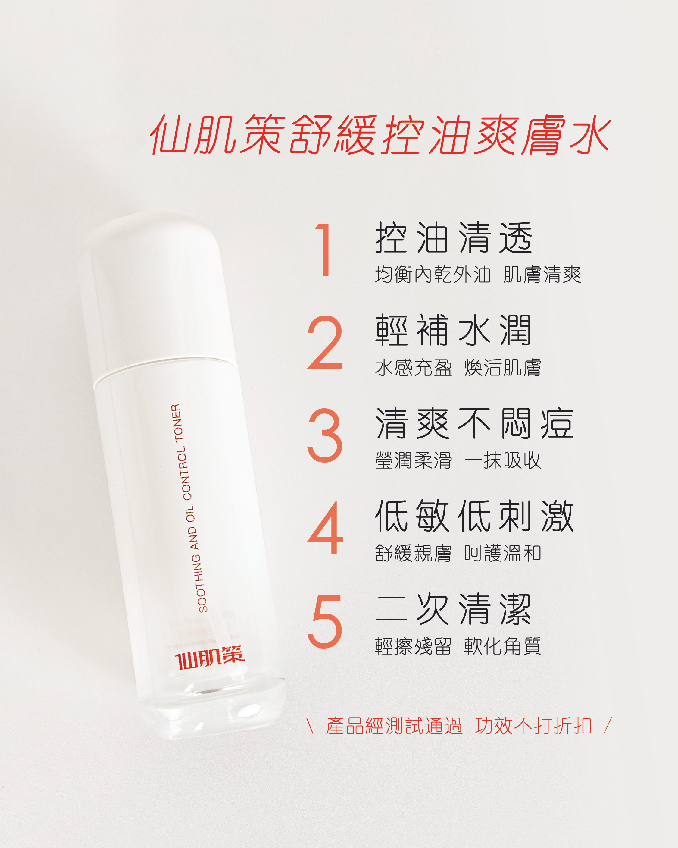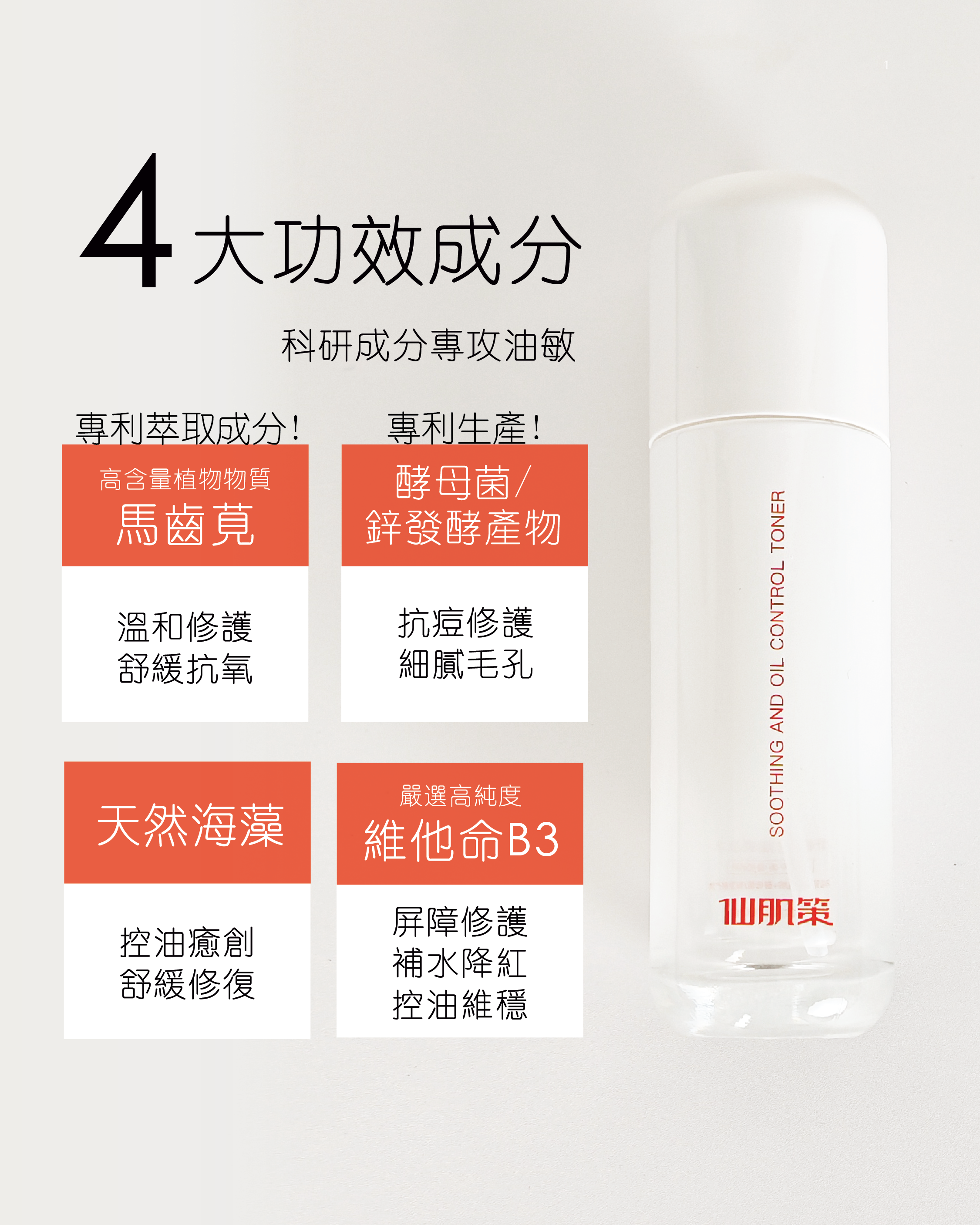 仙肌策舒緩控油爽膚水的舒緩和控油效果經過實驗室專業測試,成分也都通過了安全檢測,功效實打實,用著很放心! [主要功效] 蘊含馬齒莧萃取物、維他命B3和酵母菌/鋅發酵產物等成分,具有舒緩控油的功效,提升肌膚水油平衡,改善肌膚出油狀況。輕盈細滑質地,溫和無刺激親膚,有效潤澤肌膚,清爽又透氣,舒緩呵護肌膚的同時為肌膚補充水分,令肌膚水漾清透。 [功效成份] 馬齒莧、維他命B3、酵母菌/鋅發酵產物 [淨含量] 100毫升 [到期日] 2028年8月 [其他特點] 純素產品 [使用方法] 清潔肌膚後,取適量爽膚水於掌心,輕拍於臉部及頸部,輕輕按摩至吸收,避開眼周及唇部。搭配化妝棉輕抹使用,可以清潔肌膚表面的角質及皮脂。 [注意事項] 本產品僅供外用,不可食用,請存放於兒童觸及不到的地方。避免接觸眼睛,若不慎入眼,請勿揉搓,立即用清水清洗乾淨。孕婦使用前請諮詢醫生。 [貯存條件] 置於陰涼乾燥處,避免陽光直射及高溫;請置於兒童不易觸及處。 [產地] 中國 [條款細則] 圖片只供參考。資料由第三方提供,效果因人而異。