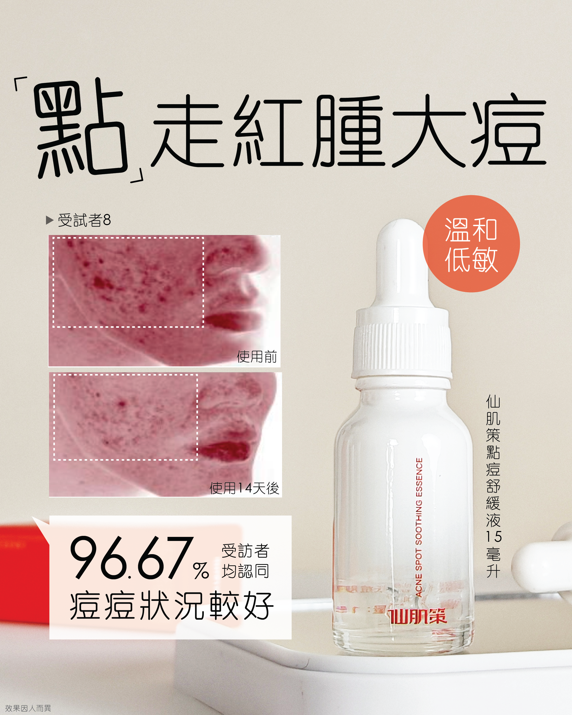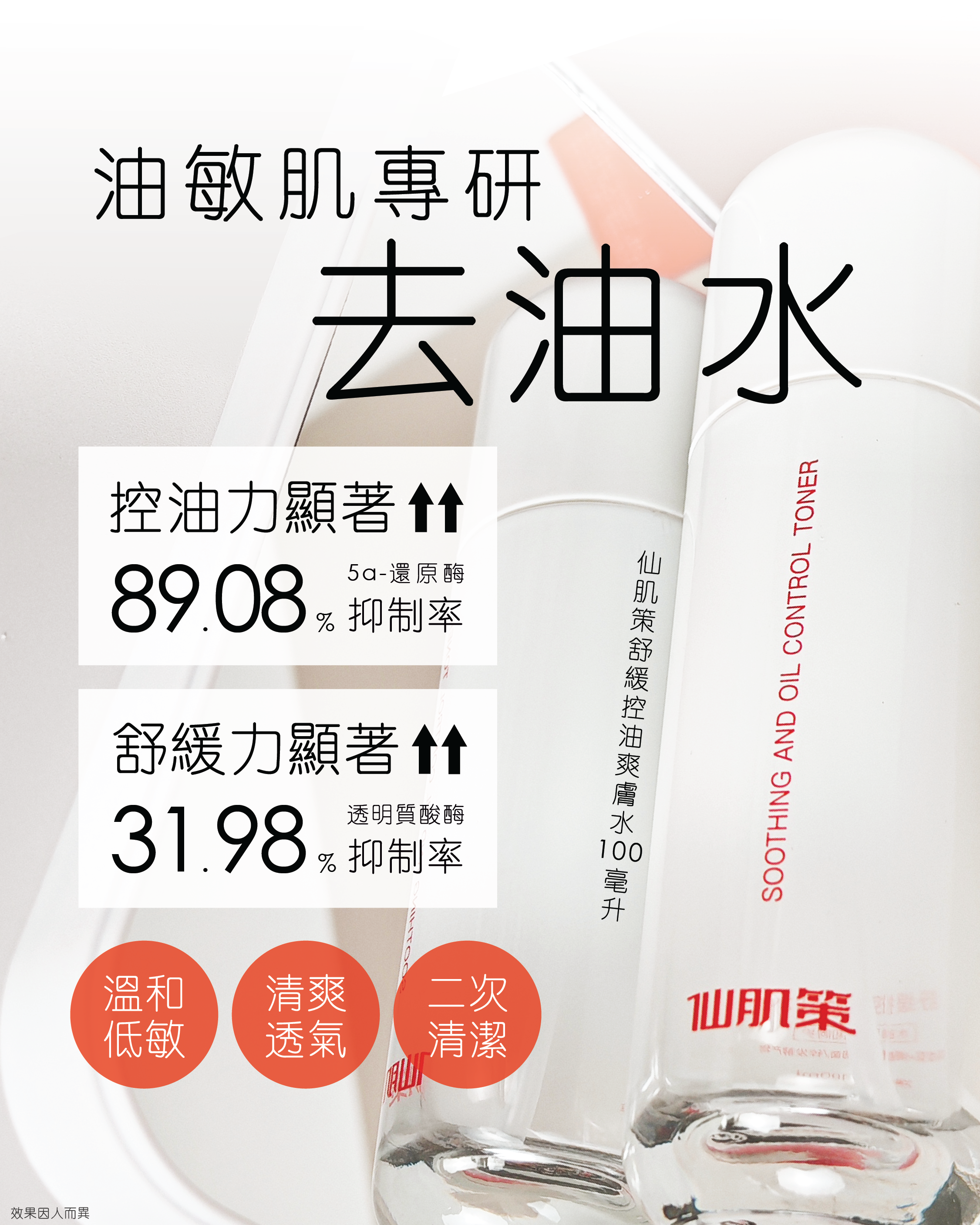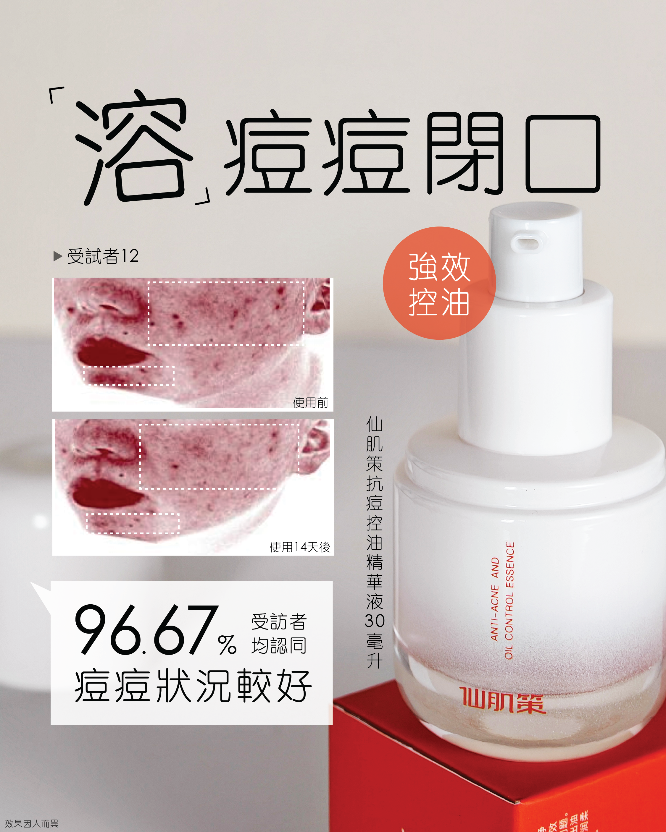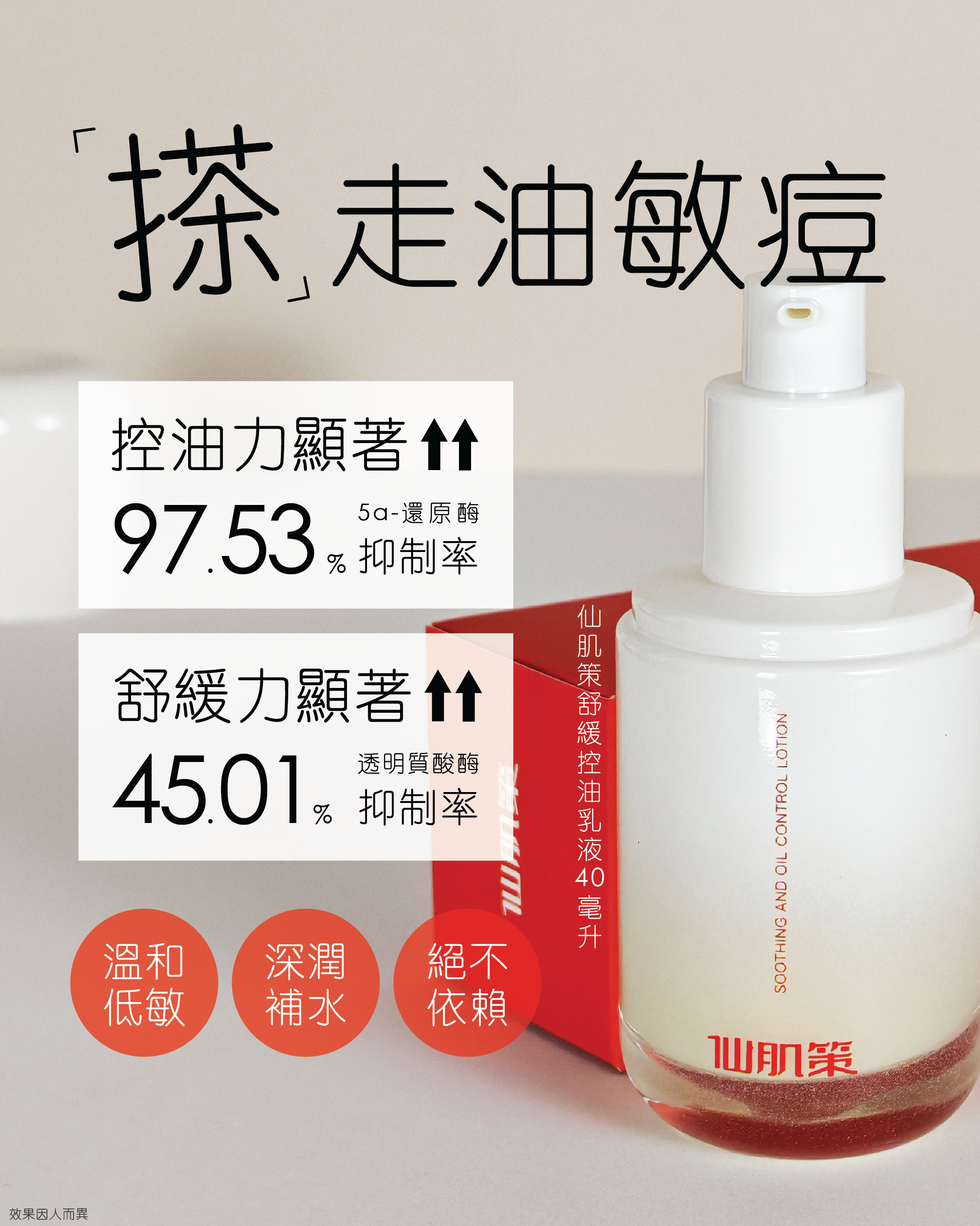 產品功效經人體臨床測試、或專業實驗室檢測認證;成分均經過安全測試審核,功效到安全都把關,更可靠~! 套裝內含4件核心單品,精準覆蓋油痘肌全週期照護需求: 仙肌策舒緩控油爽膚水100毫升 (1件) 仙肌策抗痘控油精華液30毫升 (1件) 仙肌策舒緩控油乳液40毫升 (1件) 仙肌策點痘舒緩液15毫升 (1件) 核心使用順序(從清潔後到鎖水消炎,層層遞進) 第一步: 仙肌策舒緩控油爽膚水—— 打開吸收通道,基礎精準控油 用化妝棉輕擦或手拍上臉,溫和舒緩清潔後的肌膚,快速調節水油平衡,從源頭減少出油,為後續抗痘成分吸收打牢清爽基礎 第二步: 仙肌策抗痘控油精華液 —— 深層祛痘控油雙在線,代謝角質 取適量的精華液,重點塗抹在痘痘、閉口集中區域,或全臉使用,輕輕按摩至吸收。既能精準祛痘淡印、疏通毛孔,又能溫和代謝老化角質,煥發肌膚水嫩勻淨的健康質感 第三步: 仙肌策舒緩控油乳液 —— 鎖水控油,長效維穩 取適量乳液均勻塗抹在臉上,深潤補水不緊繃,牢牢鎖住前序營養,從根源抑制痘痘再生,讓肌膚全天保持「清爽不油膩」、「水潤不乾燥」的穩定狀態 第四步: 仙肌策點痘舒緩液 —— 精準急救,針對性修護 針對紅腫大痘、新冒痘點和痘印,取少量點塗,無需大面積塗抹。快速祛痘舒緩不刺激,減少紅腫不適,同時預防痘印加深,實現精準靶向修護 [到期日] 2028年8月 [其他特點] 純素產品 [注意事項] 本產品僅供外用,不可食用,請存放於兒童觸及不到的地方。避免接觸眼睛,若不慎入眼,請勿揉搓,立即用清水清洗乾淨。孕婦使用前請諮詢醫生。 [貯存條件] 置於陰涼乾燥處,避免陽光直射及高溫;請置於兒童不易觸及處。 [產地] 中國 [條款細則] 圖片只供參考。資料由第三方提供,效果因人而異。